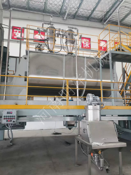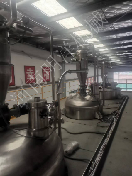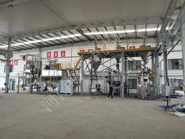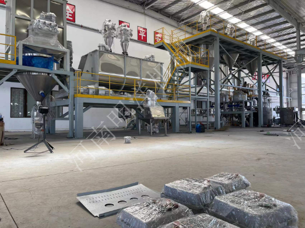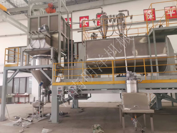 噸包無塵投料站,真空上料機氣力輸送,臥式螺帶混合機,真空上料機輸送,緩存?zhèn)},篩分除磁包裝生產(chǎn)線。
